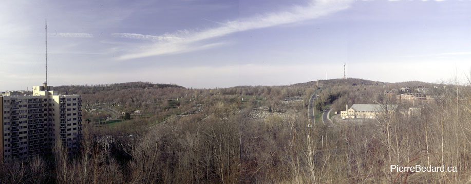 | Ce panorama montrant la vue depuis le versant nord de la butte de Westmount, expose les buttes d'Outremont (à gauche) et Royal (à droite). Les cimetières Côte-des-neiges et du mont Royal occupent la partie centrale en dépression. |