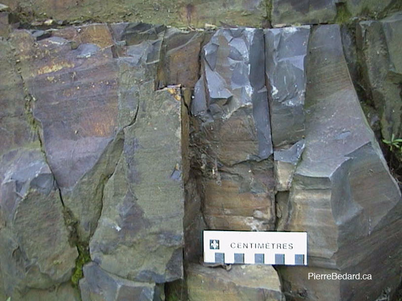 ![]() Photo 1 On peut observer la stratification sub-horizontale. La roche saine est gris foncée, à grain fin, très dure et montre des cassures conchoïdales. La roche altérée devient de couleur brun rouille. |