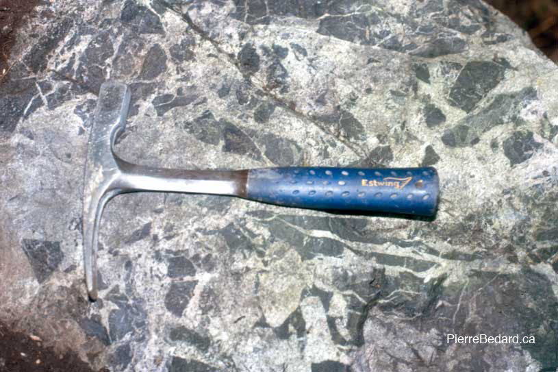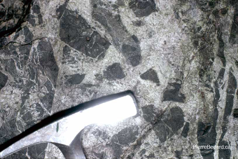 ![]() Photo 1 Cette brèche d'intrusion contient des fragments anguleux de gabbro noir (mélanocrate) flottant dans la monzonite de teinte claire. |